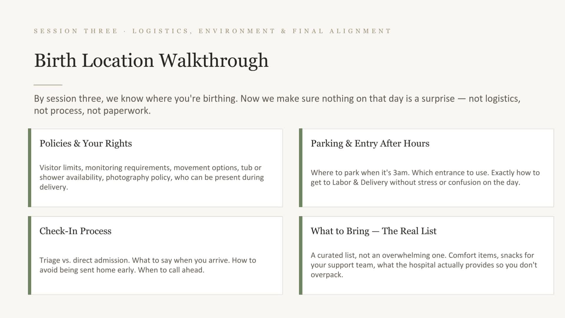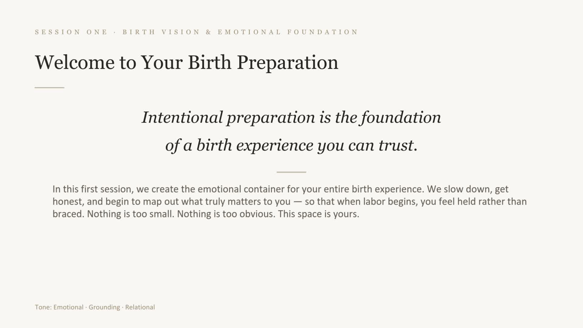 It All Begins Here Skip to Videos All | Prenatal Session | Prenatal Session- | Prenatal Session -- | Prenatal Session-, Prenatal One: Birth Vision & Preparation Prenatal Session, Prenatal Two: Informed Decision & Practical Strategy Prenatal Session --, Prenatal Three: Logistics, Environment, & Final Alignment